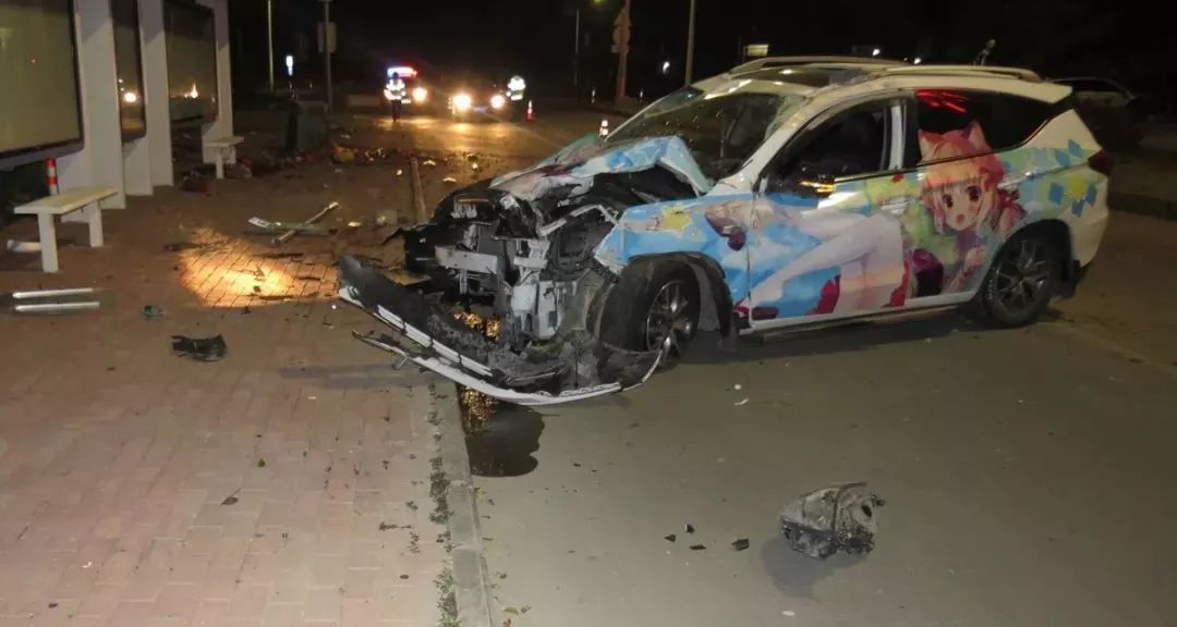 萬(wàn)幸的是,車(chē)上的安全氣囊都及時(shí)打開(kāi)了,盡管車(chē)上四人嚇得魂飛天外,但身體都沒(méi)啥大礙,只有司機(jī)譚某的左手有些輕微擦傷。陳警官趕到現(xiàn)場(chǎng),只見(jiàn)一輛粵CT××33比亞迪小車(chē)打橫停靠路邊,臭烘烘的垃圾撒了一地,垃圾桶倒在一邊,交通指示牌和警示樁也被撞得連根拔起,情況比預(yù)想的要嚴(yán)重得多。陳警官發(fā)現(xiàn),小車(chē)車(chē)前蓋和兩側(cè)車(chē)身貼滿了動(dòng)漫美少女貼膜,但由于撞擊,原本萌萌的美少女此時(shí)變得有些猙獰。