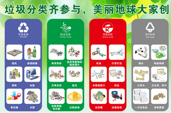 (5)布料:主要包括廢棄衣服、桌布、毛巾、布包等 如每回收1噸廢紙可造好紙850公斤,節省木材300公斤,比等量生產減少污染74%;每回收1噸塑料飲料瓶可獲得0.7噸二級原料;每回收1噸廢鋼鐵可煉好鋼0.9噸,比用礦石冶煉節約成本47%,減少空氣污染75%,減少97%的水污染和固體廢物。 可回收物以外的垃圾基本上都是廢棄物。比如煙頭、雞毛、廢電、煤渣、建筑垃圾、油漆顏料、食品殘留物等等。 有毒垃圾,包括廢電池、日光燈管、水銀溫度計、油漆筒、藥品、化妝品等。 垃圾是放錯了地方的財富。